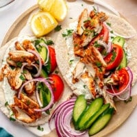 These chicken gyros are ridiculously good! Slathered with tzatziki sauce (the limit does not exist, so spoon on as your heart desires) and stuffed with juicy yogurt-marinated chicken thighs, crunchy cucumbers, tomato wedges, and red onions, these make for the yummiest dinner or lunch option.